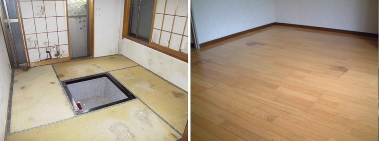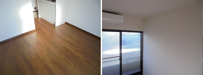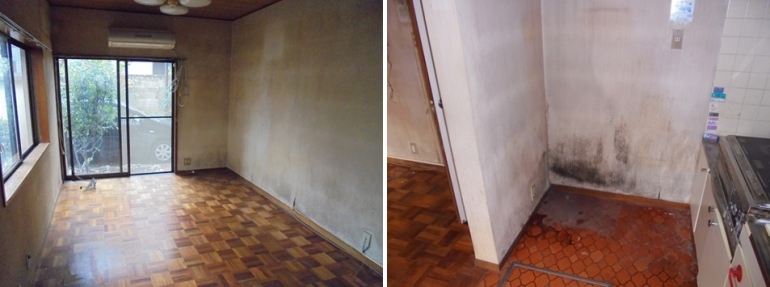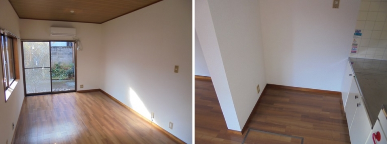 まずメインであるリビングダイニングの床が所々沈んでしまう為、基礎となる根太の補修工事、コンパネ下地工事を行い、最後はフローリング調のクッションフロアで仕上げ工事を致しました。