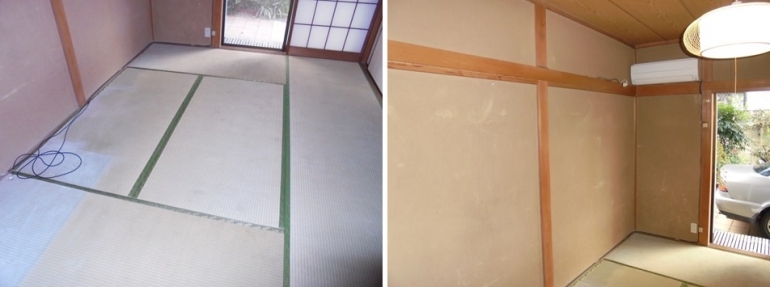 ・リビング床下地補強工事/クロス張替工事/床クッションフロア張替工事/和室壁下地工事(砂壁撤去)/ハウスクリーニング他